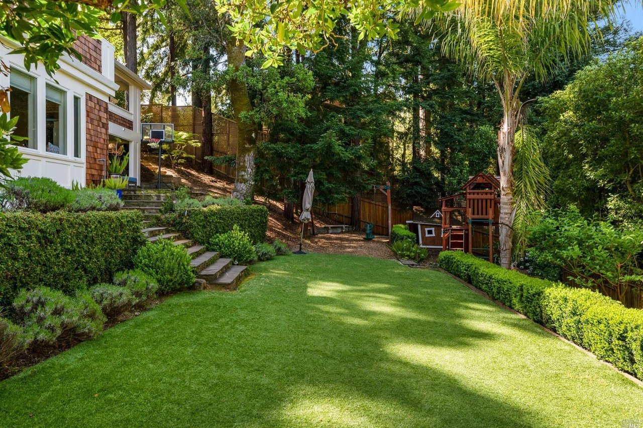 Tucked away on a quiet Cul-de-Sac, this classic updated 4 bedroom, 3.5 bath brown shingle home offers a serene outlook. Entering the gated driveway you immediately notice the artfully landscaped garden surrounded by heritage Redwoods, Douglas Firs and Palm trees. This distinctive residence has a living room and dining area with a cathedral ceiling, fireplace and lovely wide planked walnut floors. The custom chef's kitchen with a grand scale center island and a breakfast nook lures both family and friends to just hang out and socialize. An adjoining family room with fireplace gives way to a spacious and gracious deck overlooking the valley. Down the hall are three bedrooms including a master suite with a walk in closet, balcony and a ensuite bathroom complete with a sumptuous bath and steam shower. The downstairs features a guest bedroom with luxury bath, a large office, a laundry room, and a fitness/yoga room. Amazing outdoor entertaining spaces. www.51Hillcrest.com